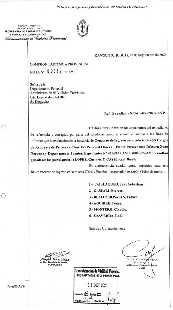 Adjuntamos las notas de la Comisión Paritaria Provincial con los ganadores y el orden de mérito definitivo.